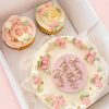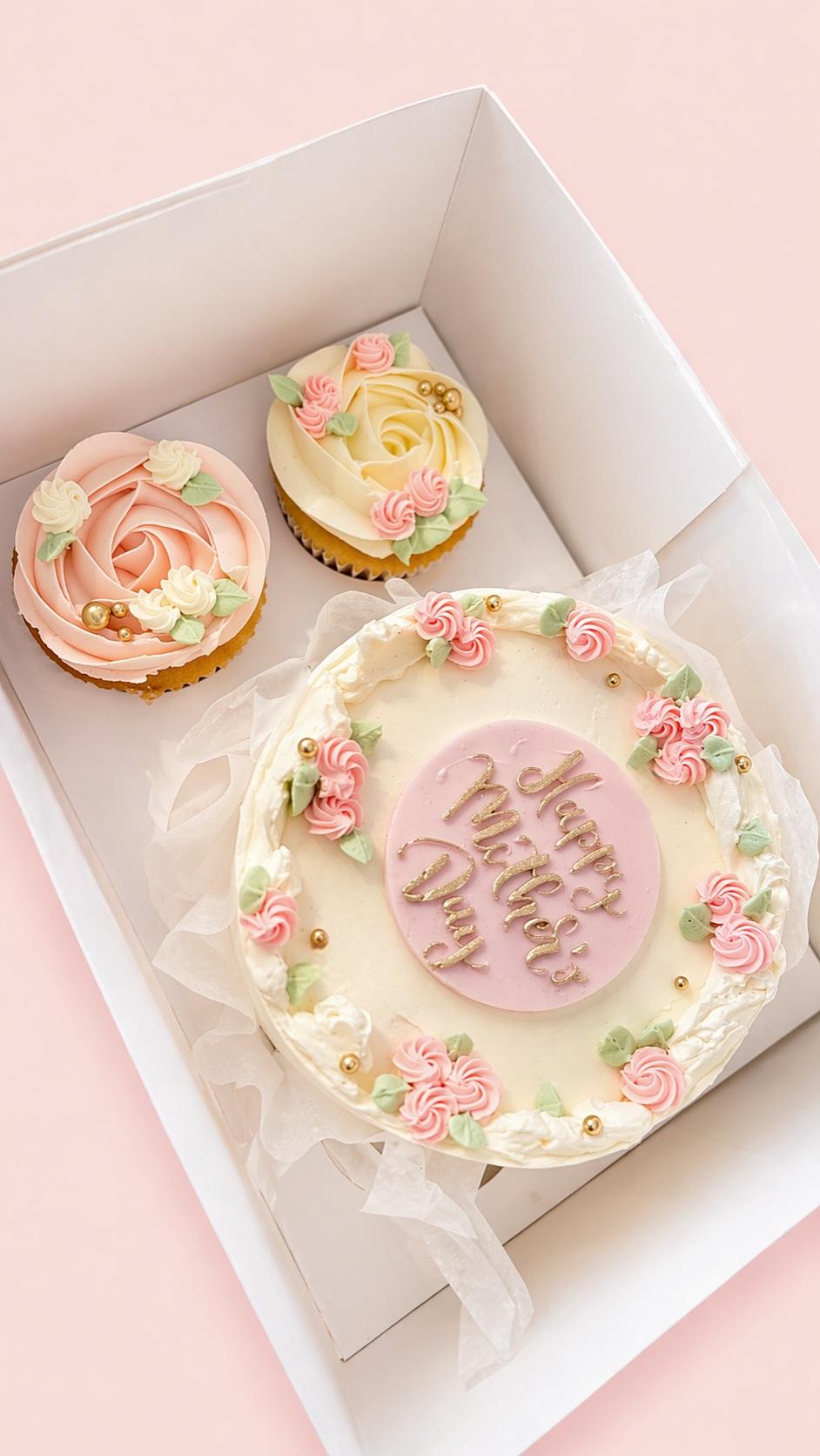 Une élégante boîte gourmande comprenant un gâteau bento (format 3 à 4 personnes) accompagné de 2 cupcakes assortis, soigneusement présentés dans un coffret prêt à offrir. Une création délicate et raffinée, parfaite pour célébrer la fête des mères avec douceur et gourmandise.