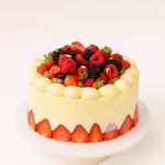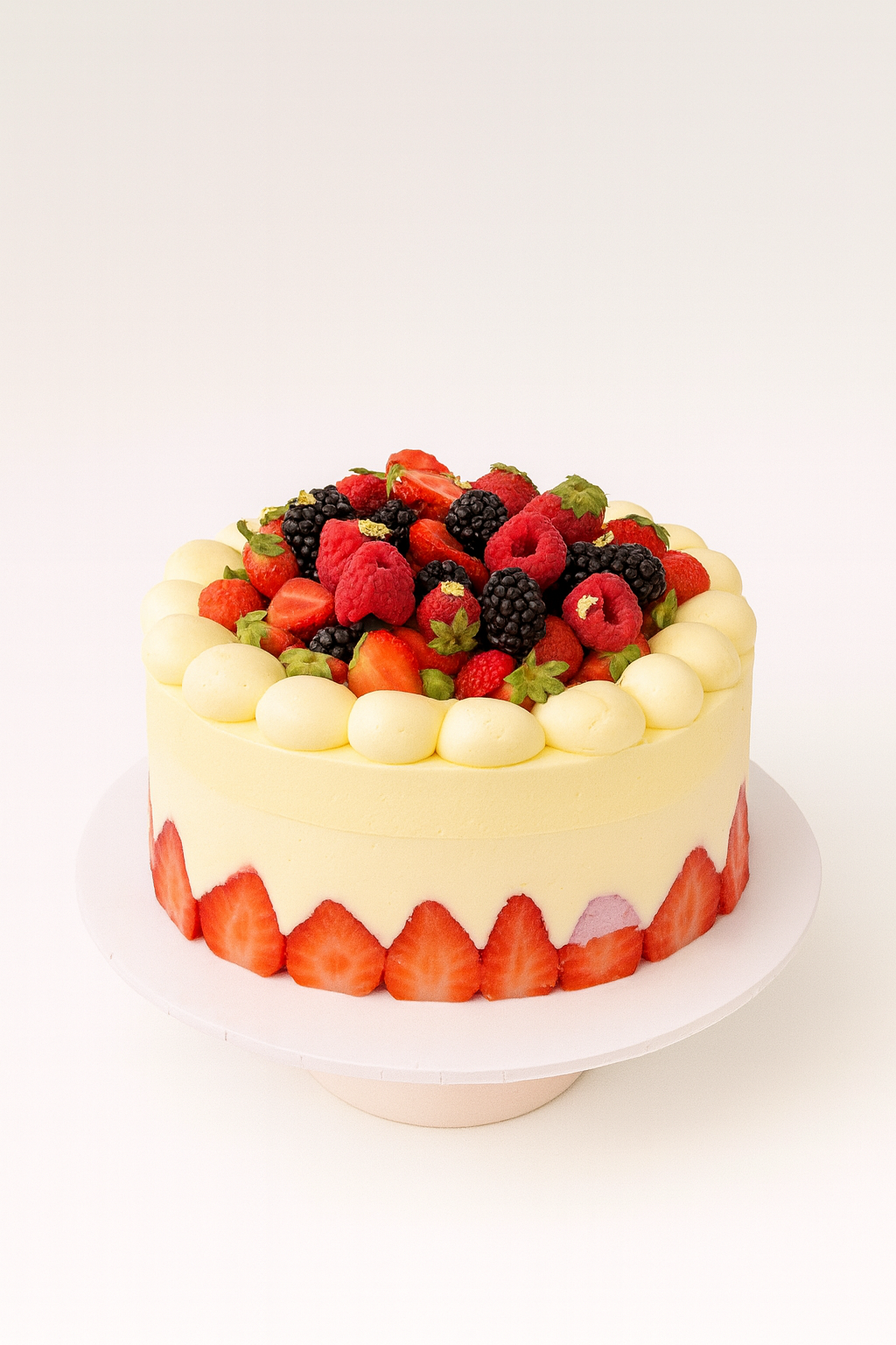 Un gâteau délicat et raffiné : une génoise vanillée toute en légèreté, une crème aérienne à la vanille et une profusion de fruits rouges pour une touche fraîche et gourmande.