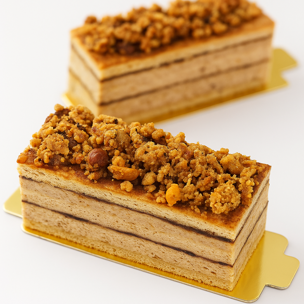 Un biscuit moelleux à la noisette, d’une crème onctueuse à la noisette et d’un praliné maison généreux et fondant.