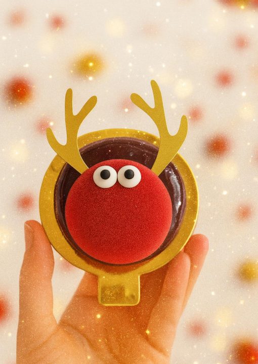 Un entremets festif alliant la douceur de la noisette à l’intensité du chocolat. Sous sa forme de petit renne gourmand se cache une mousse chocolat onctueuse, un praliné généreux et un cœur fondant aux noisettes. Le tout offrant une bouchée croquante, fondante et irrésistiblement gourmande.